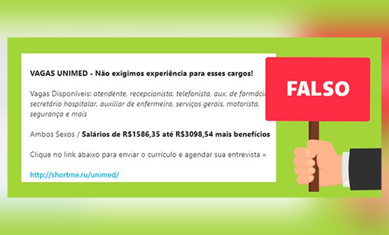 Frequentemente, a área de Comunicação e Marketing da Unimed do Brasil recebe informações sobre a circulação de anúncios falsos de vagas de emprego no Sistema. Essas divulgações têm como intuito a coleta de dados pessoais de usuários para utilização indevida.