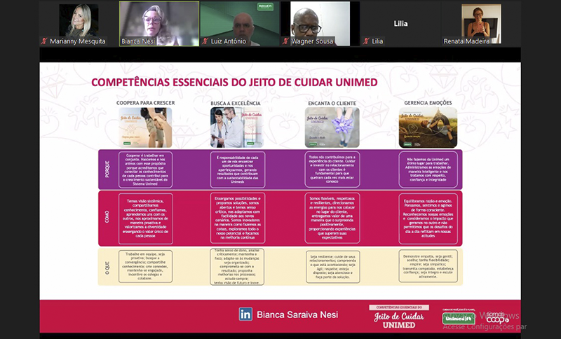 Em 27 de setembro, com o objetivo de seguir com a disseminação das competências essenciais do Jeito de Cuidar Unimed, na Federação, a área Administrativo – Gestão de Pessoas realizou uma live com a consultora corporativa com atuação em Comportamento Organizacional, Bianca Nesi. O momento, que foi aberto para todos os colaboradores, ocorreu por meio da ferramenta Zoom e focou na competência “Gerencia Emoções”. O tema já havia sido disseminado, anteriormente, entre as lideranças. Essa é apenas a primeira das quatro que ainda serão trabalhadas pela organização.