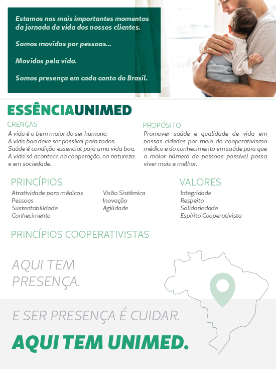 “Escolhemos este evento para apresentar as crenças, o propósito, os princípios e os valores que atualizam a nossa identidade organizacional, a Essência Unimed. Em todo o Brasil tem Unimed. Aqui nesta sala tem Unimed. E que, em cada um de nós, tenha sempre a Unimed!”, anunciou o presidente da Confederação, Omar Abujamra Junior.