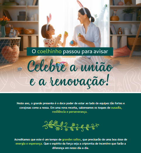 As equipes de Mercado e Gestão de Pessoas da Federação prepararam uma surpresa para os colaboradores, em campanha da Páscoa. Foi enviado, no dia 4 de abril, um e-mail com a mensagem do famoso coelhinho desejando a celebração da união e da renovação.