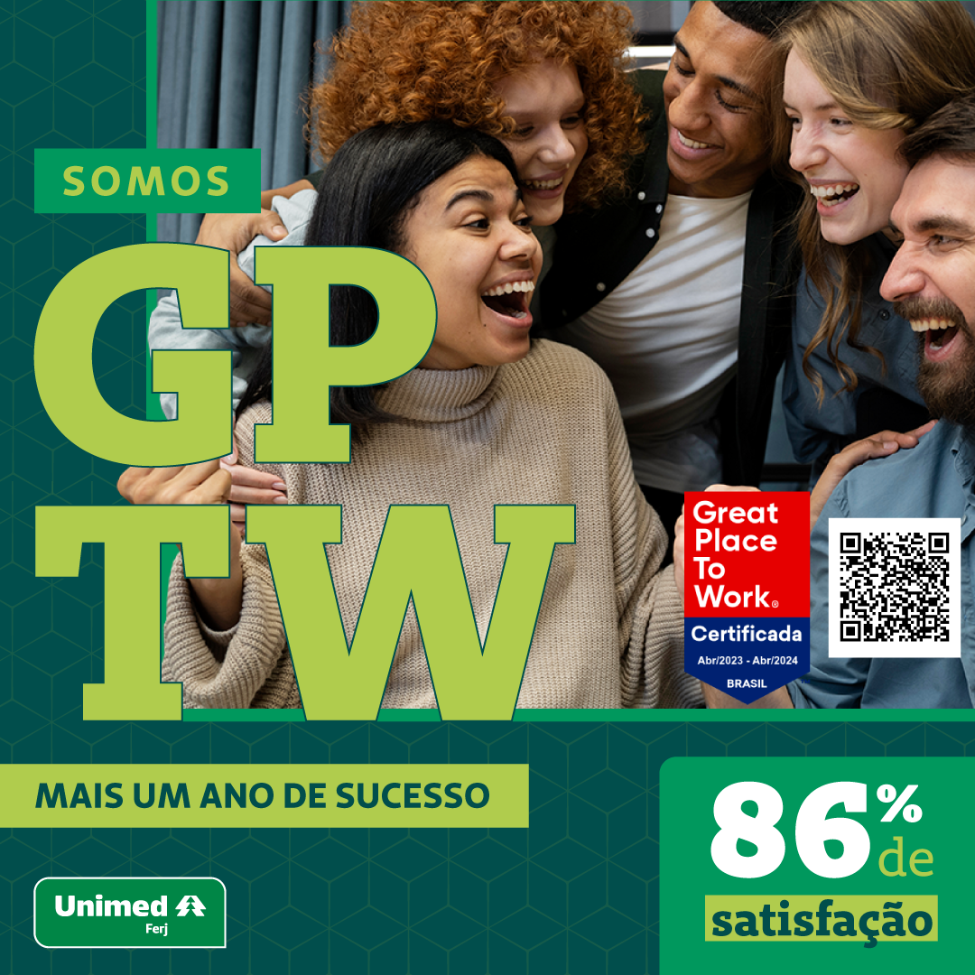 A Unimed Ferj recebeu, em mais um ano, o selo do Great Place to Work (GPTW), de acordo com a pesquisa realizada entre nossos colaboradores que reuniu 86% de satisfação. Foram avaliados, como os principais critérios, a credibilidade, o respeito, a imparcialidade, o orgulho e a camaradagem de nossos times.