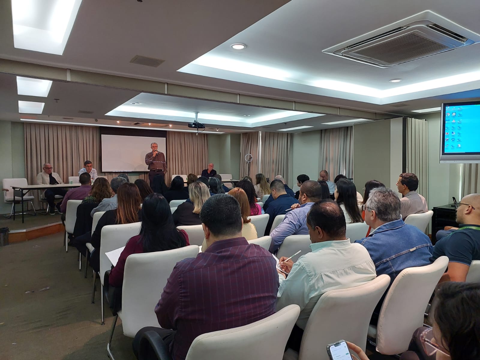 A primeira reunião do Comitê de Apoio Técnico à Gestão da Sinistralidade – Ferj (Catges) aconteceu, em 11 de julho, para mais de 50 representantes das 17 Unimeds fluminenses, no auditório da Unimed Ferj. Durante o encontro, o presidente da cooperativa, João Alberto da Cruz, e os diretores Administrativo-Operacional, Fábio Nasser Monnerat; Financeiro, Rodrigo Luna Venâncio; e Intercâmbio e Integração, José Manes, explanaram sobre as necessidades das novas medidas adotadas para a sustentabilidade do negócio, no estado, e as expectativas futuras com a criação da Unimed Ferj.