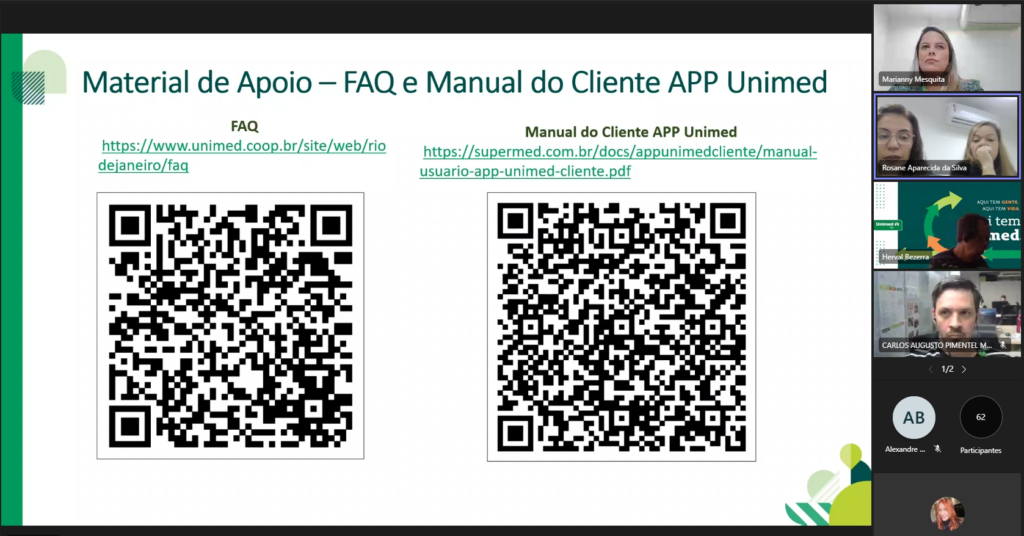 Já a gerente de Relacionamento e Intercâmbio e a supervisora de Atendimento da cooperativa, Adriana Paixão e Rosane Silva, esclareceram as principais dúvidas para garantir o melhor acolhimento ao nosso beneficiário e destacaram a disponibilidade do manual do APP Unimed Cliente e o FAQ, que pode acessado pelo link https://www.unimed.coop.br/site/web/riodejaneiro/faq.