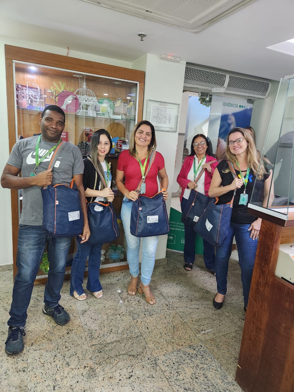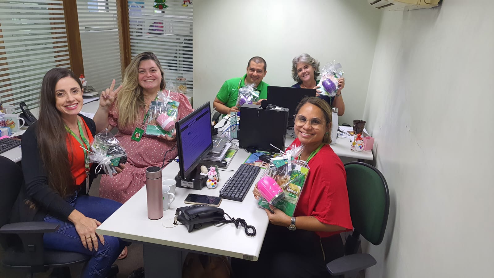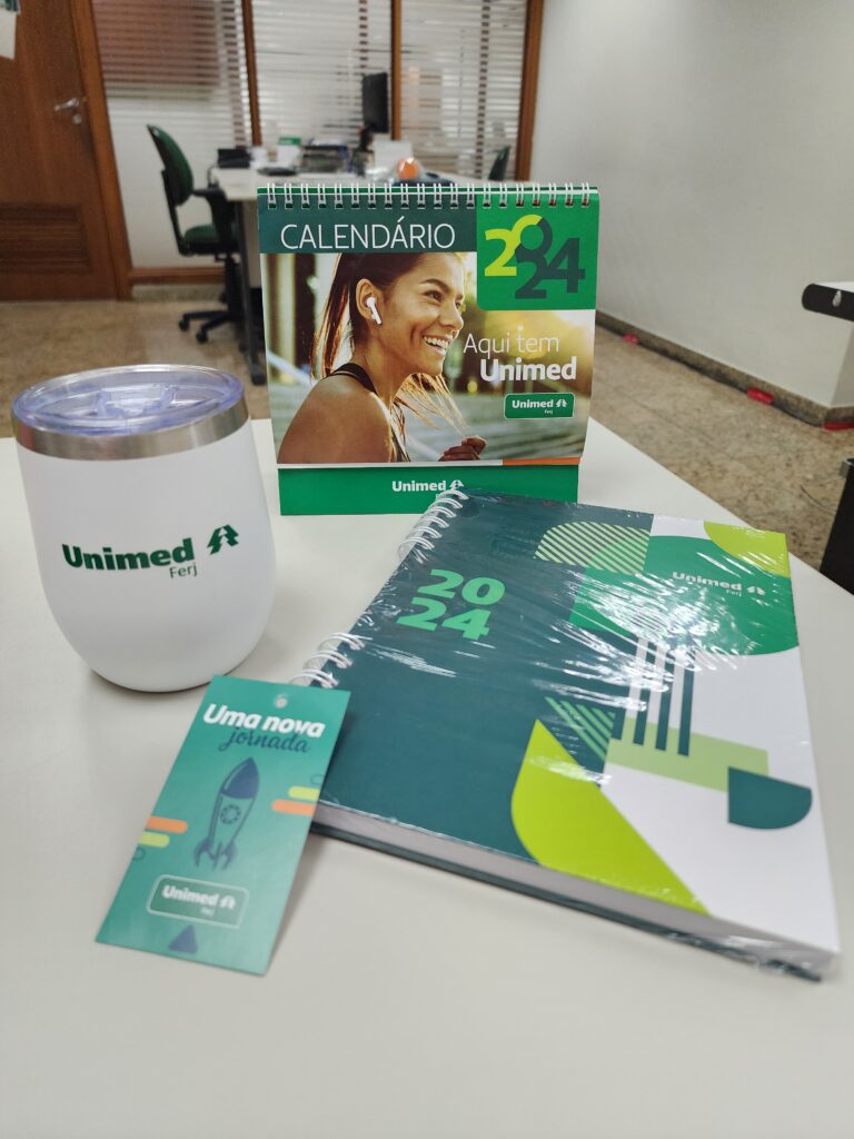 Na manhã seguinte, no dia do evento de confraternização, todos os colaboradores foram surpreendidos ao chegar na sua área de trabalho e encontrar um kit, composto por um copo térmico, um caderno e um calendário 2024.