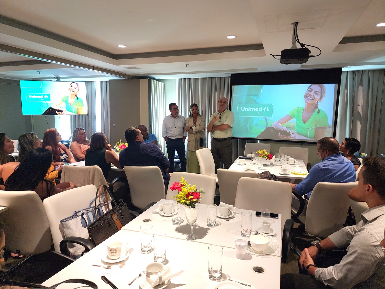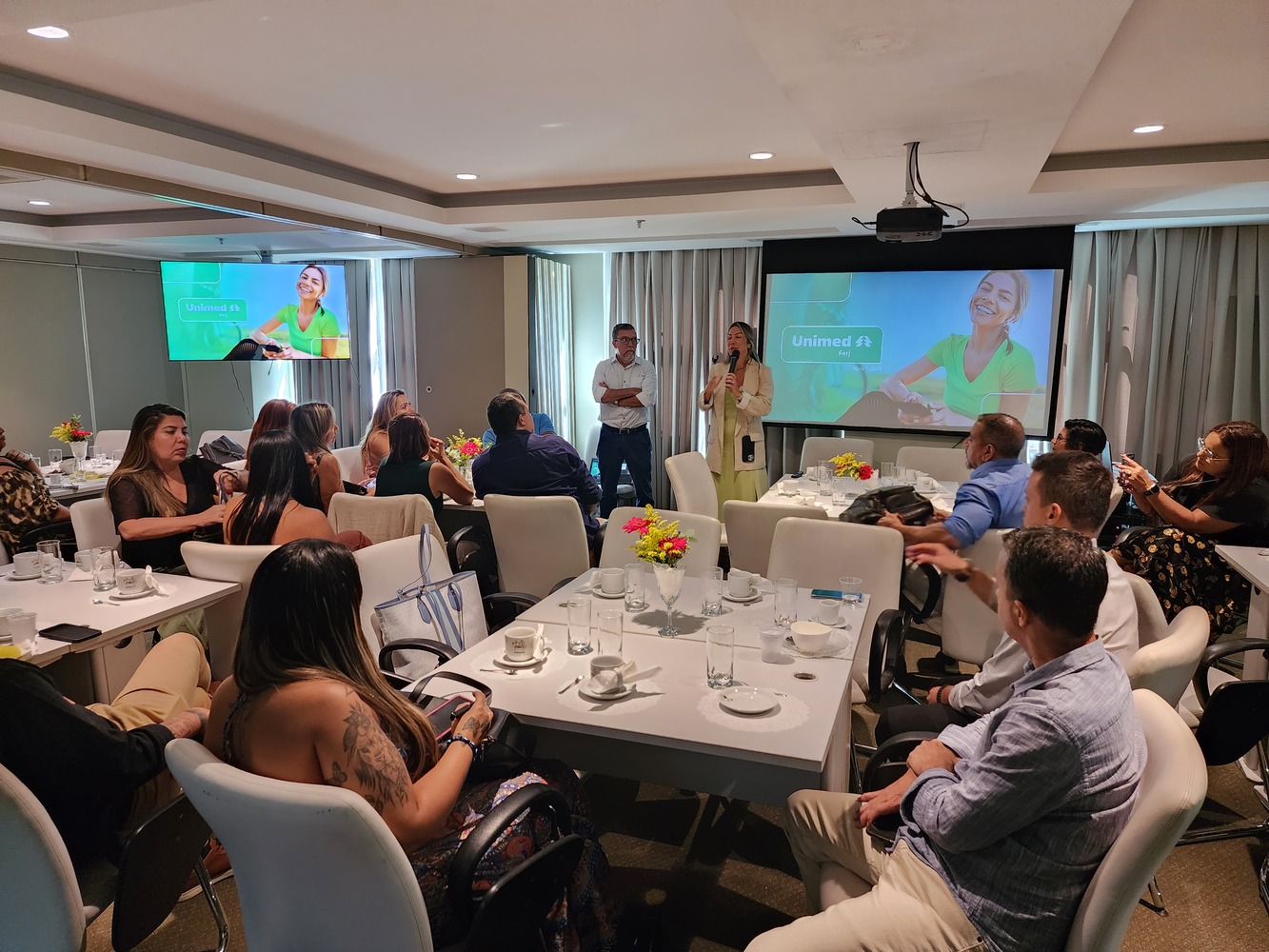 A gerente da área, Adriana Abrantes, iniciou o encontro com muita emoção e motivação. “Queria, antes de tudo, agradecer a presença de todos. Vocês foram escolhidos a dedo porque realmente fazem a diferença! Corretores amorosos, trabalhadores guerreiros, profissionais de primeira, que representam essa marca com muito respeito e muito carinho. Então, gratidão eterna por vocês estarem aqui, os primeiros a sentirem o ‘gostinho’ da Unimed Ferj. E podem ter certeza de que, com o esforço conjunto, seremos a maior operadora do Rio de Janeiro!”, vibrou.