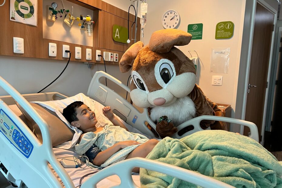 Coelhinho da Páscoa visita ala pediátrica do Hospital Unimed Ferj e leva alegria para crianças, pais e equipe assistencial