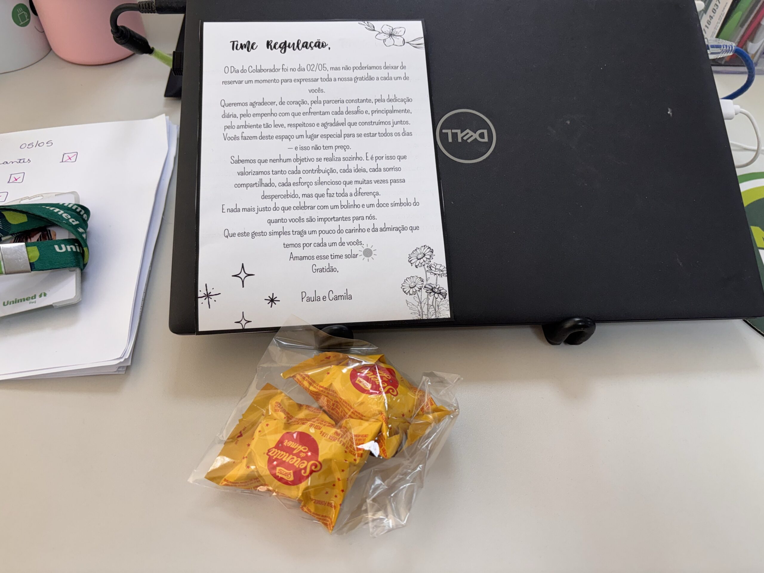 Recebi uma surpresa muito especial da minha gestão. Esse gesto simples, mas significativo, me fez sentir valorizada e reconhecida, mostrando o quanto o trabalho é respeitado em nosso time. Agradeço à Camila Paiva e à Ana Paula Polli pela liderança atenta e pelo ambiente de trabalho motivador”. – Camila Ferreira, analista de Regulação.