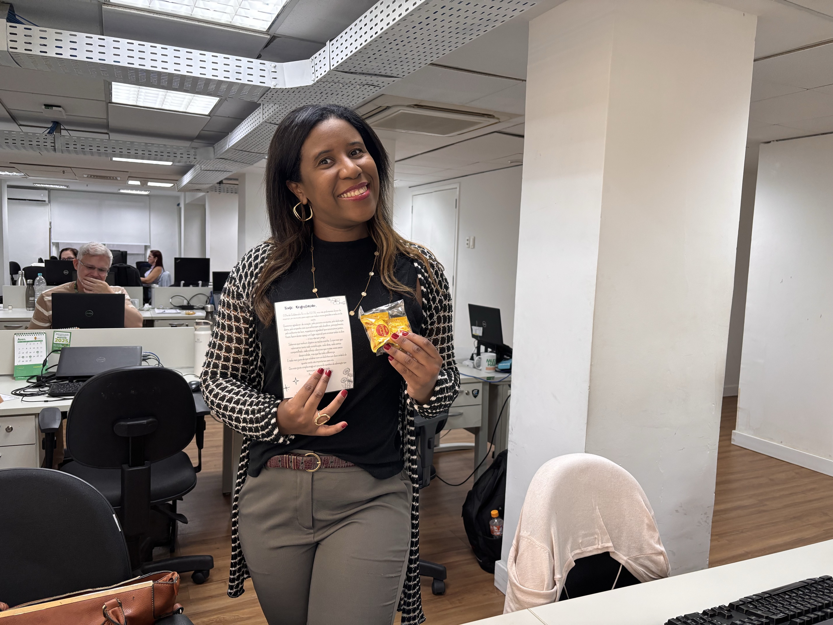 Foi emocionante ver a reação de cada um, com sorrisos imediatos e a sensação de acolhimento no ar. Esse simples gesto de carinho e conexão fez toda a diferença, criando um momento único que vou guardar com muito afeto e gratidão”. – Vania Silva, analista de Negociação.