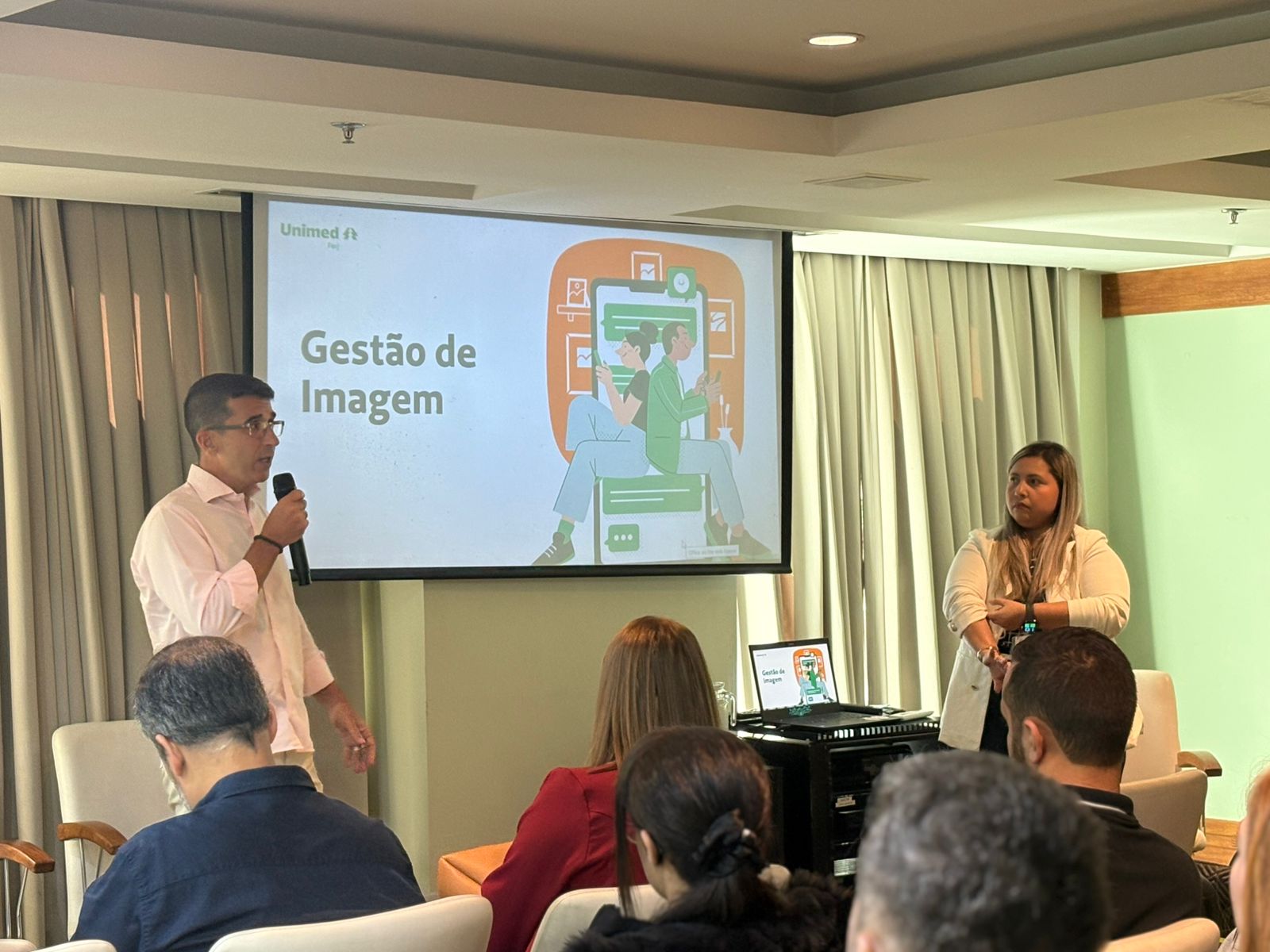 Em seguida, o gerente e o coordenador do setor de Relacionamento, Eugenio de Oliveira Filho e Guilherme Carvalho, respectivamente, compartilharam insights e ressaltaram a importância da gestão de imagem digital. Logo depois, a coordenadora de Comunicação e Marketing – Cliente, Marcela Magalhães, abordou o mercado de saúde suplementar fluminense, trazendo reflexões importantes sobre o cenário atual.