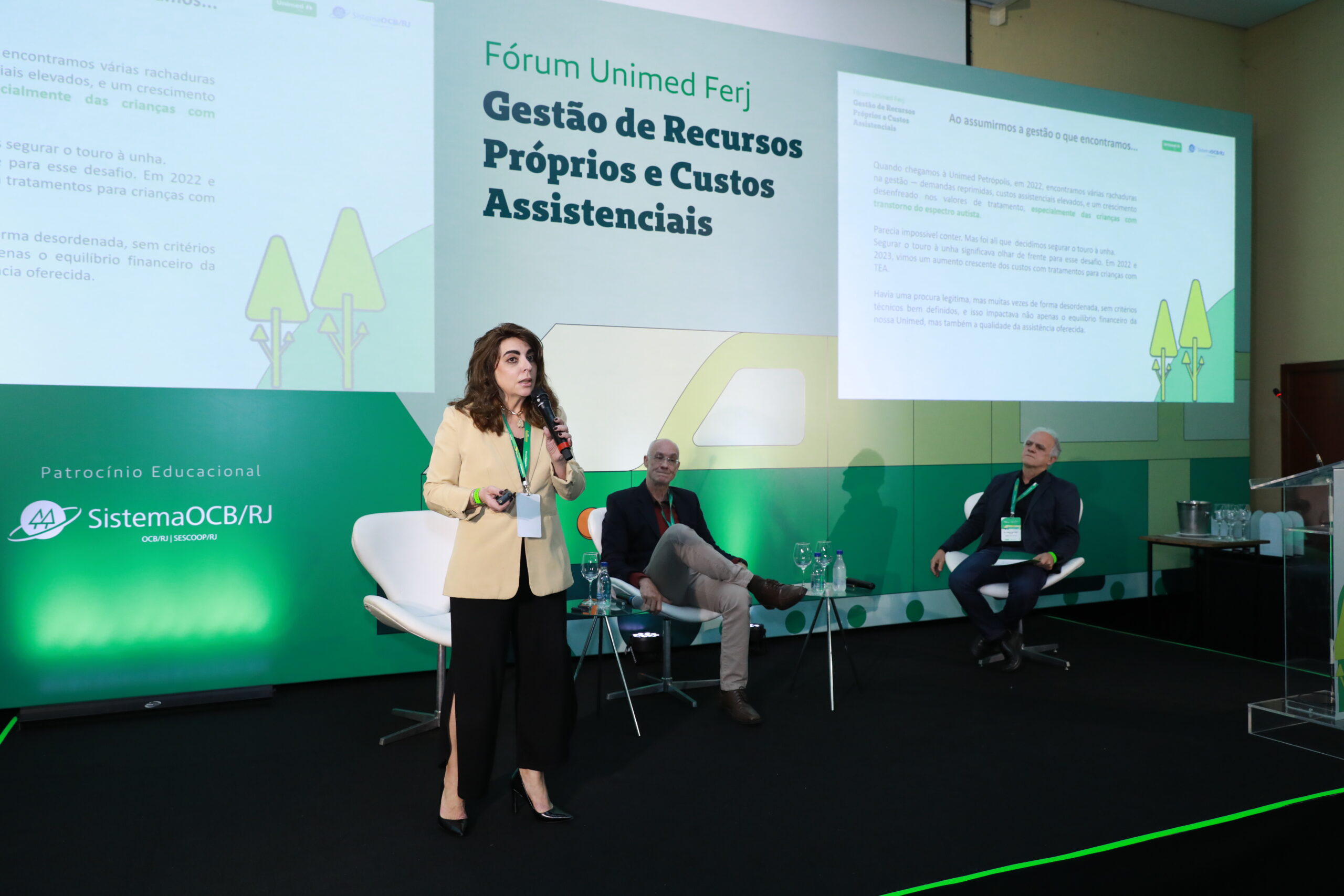 A programação do último dia do fórum começou com uma mesa-redonda sobre Tratamentos de Alto Custo: Centros Especializados como Estratégia de Sustentabilidade, mediada pelo diretor de Mercado da Unimed Ferj, José Marcos Pillar. Na primeira parte, o médico pediatra da Unimed Mercosul, Renato Coelho, dissertou sobre a jornada no cuidado do Transtorno do Espectro Autista (TEA). A diretora técnica do Espaço Cuidar Bem da Unimed Ferj, Lívia Moura, participou do momento, e falou sobre práticas de humanização no tratamento do câncer. Na sequência, o diretor regional da MedSênior, Carlos Lobbé, destacou a verticalização como vantagem competitiva, e a gerente de Práticas Assistenciais da Unimed Ferj, Viviane Matos, abordou a gestão eficiente com indicadores assistenciais.