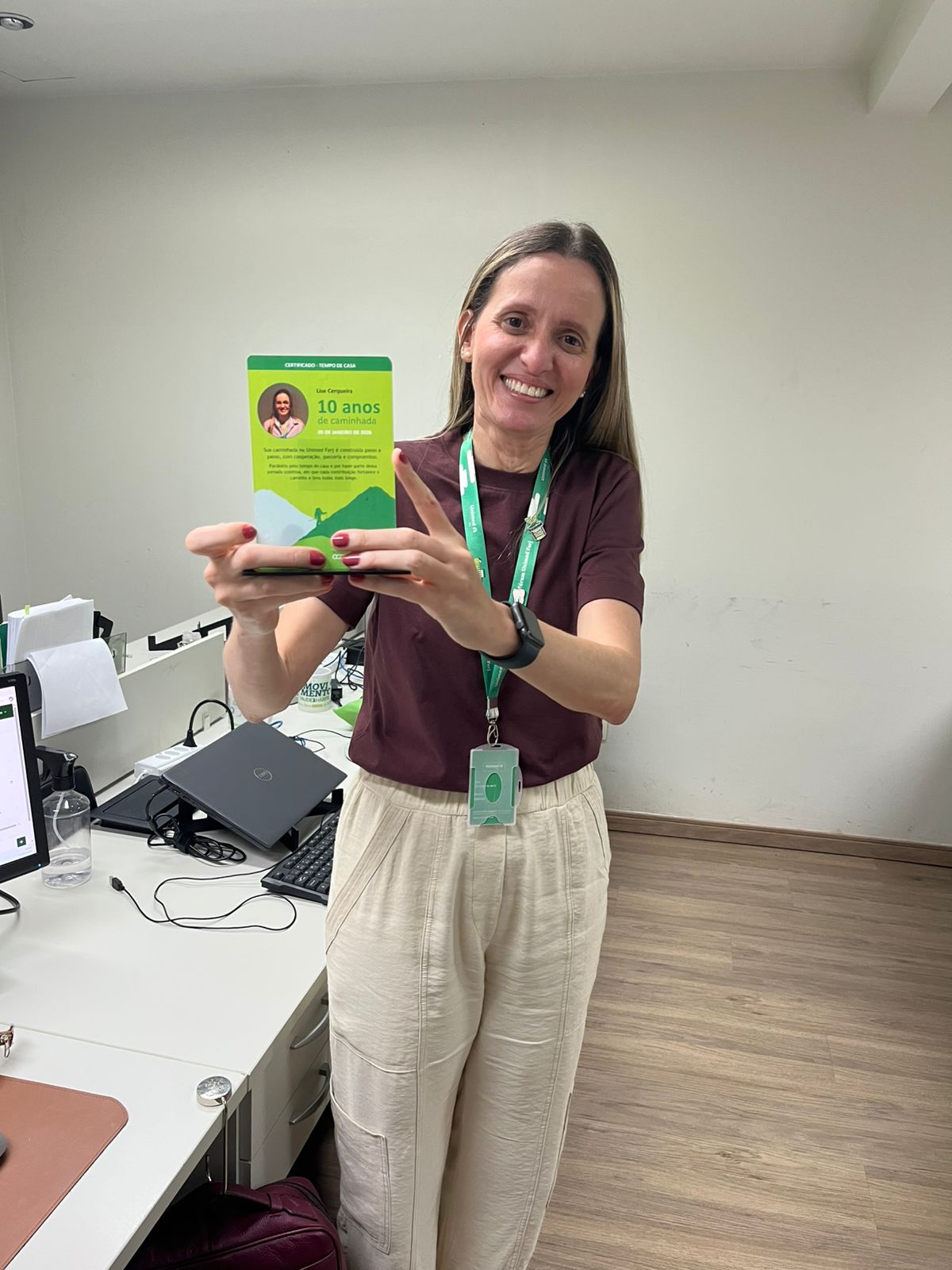 “Chegar aos 10 anos de empresa é um marco que só é possível graças ao apoio e à parceria de todos vocês. Agradeço, de coração, a cada colega que me ajudou, me apoiou, me cobrou, me fez rir e me fez crescer; à liderança que acreditou em mim e à empresa que me deu espaço para ser quem sou. Essa placa representa muito mais que 10 anos: representa uma história que construímos juntos. Obrigada por fazerem parte dela. Estou muito feliz e grata!”, disse a dentista – Saúde Bucal/Gestão de Saúde, Lise Cerqueira.